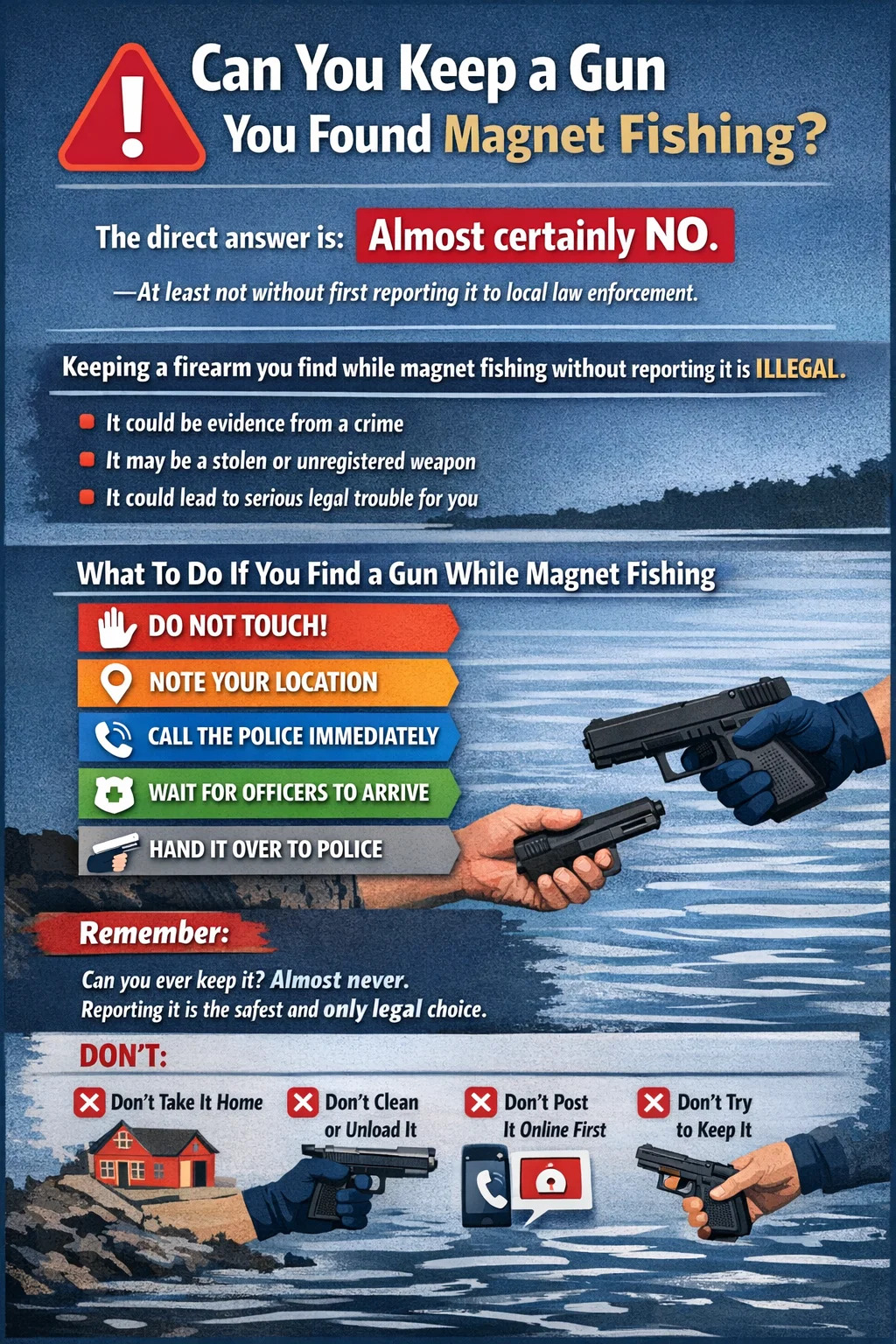 Het korte antwoord is: vrijwel zeker niet – althans niet zonder dit eerst aan de plaatselijke wetshandhaving te melden. In de meeste Amerikaanse staten, maar ook in Groot-Brittannië, Canada en Australië, is het illegaal om een vuurwapen dat je met een vismagneet uit het water hebt getrokken, achter te houden zonder dit te melden. Het wapen kan bewijsmateriaal zijn bij een misdrijf, als gestolen zijn opgegeven of een niet-geregistreerd wapen zijn. Dit alles creëert ernstige juridische risico's voor u op het moment dat u besluit ermee weg te lopen.