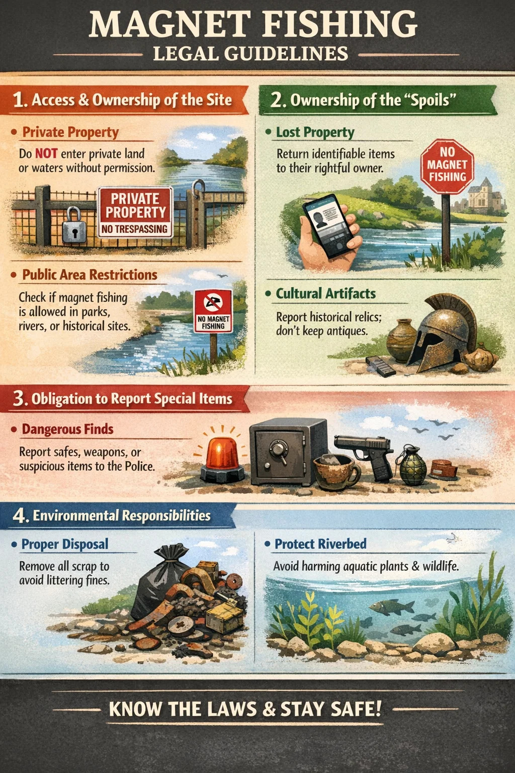 Voordat u aan magneetvissen begint, is het van cruciaal belang dat u de relevante wet- en regelgeving begrijpt. Hoewel deze activiteit op veel plaatsen wordt beschouwd als een positieve manier om het milieu schoon te maken, gaat het juridisch gezien gepaard met verschillende aspecten, zoals landrechten, eigendom van teruggevonden voorwerpen en openbare veiligheid.