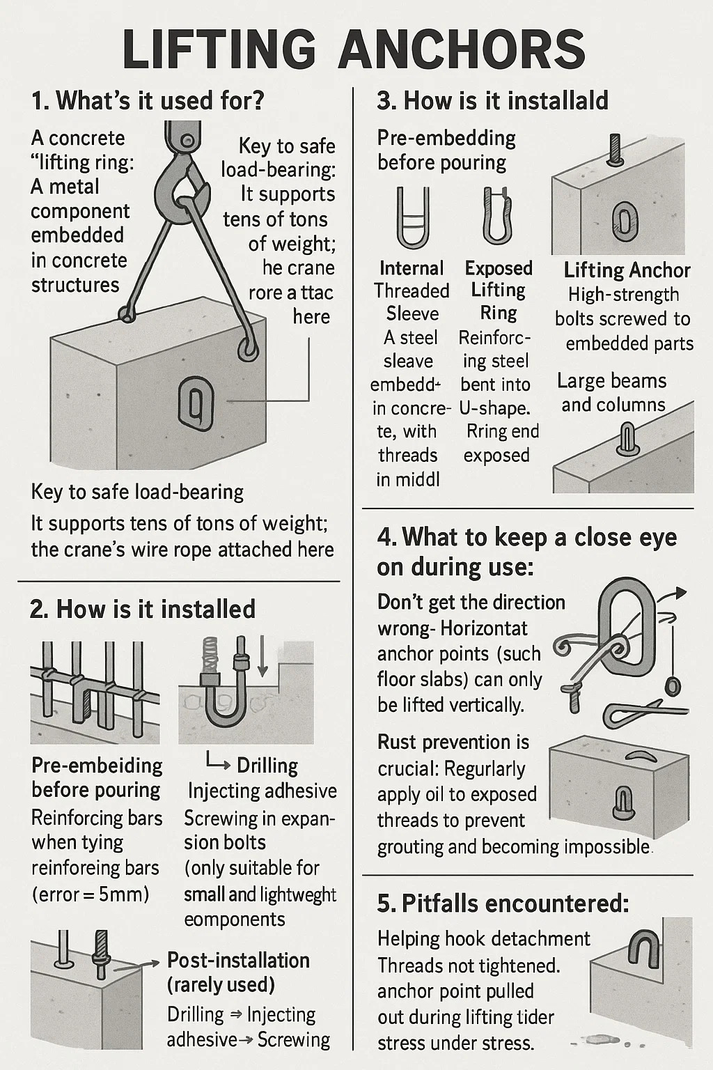 Voorinbedden vóór het storten: ① Fixeer de positie van het ankerpunt bij het verbinden van wapeningsstaven (fout ≤ 5 mm) ② Las moffen/U-ringen aan de hoofdwapeningsstaven om verplaatsing te voorkomen ③ Vermijd ankerpunten tijdens betontrillingen om voegen te voorkomen
