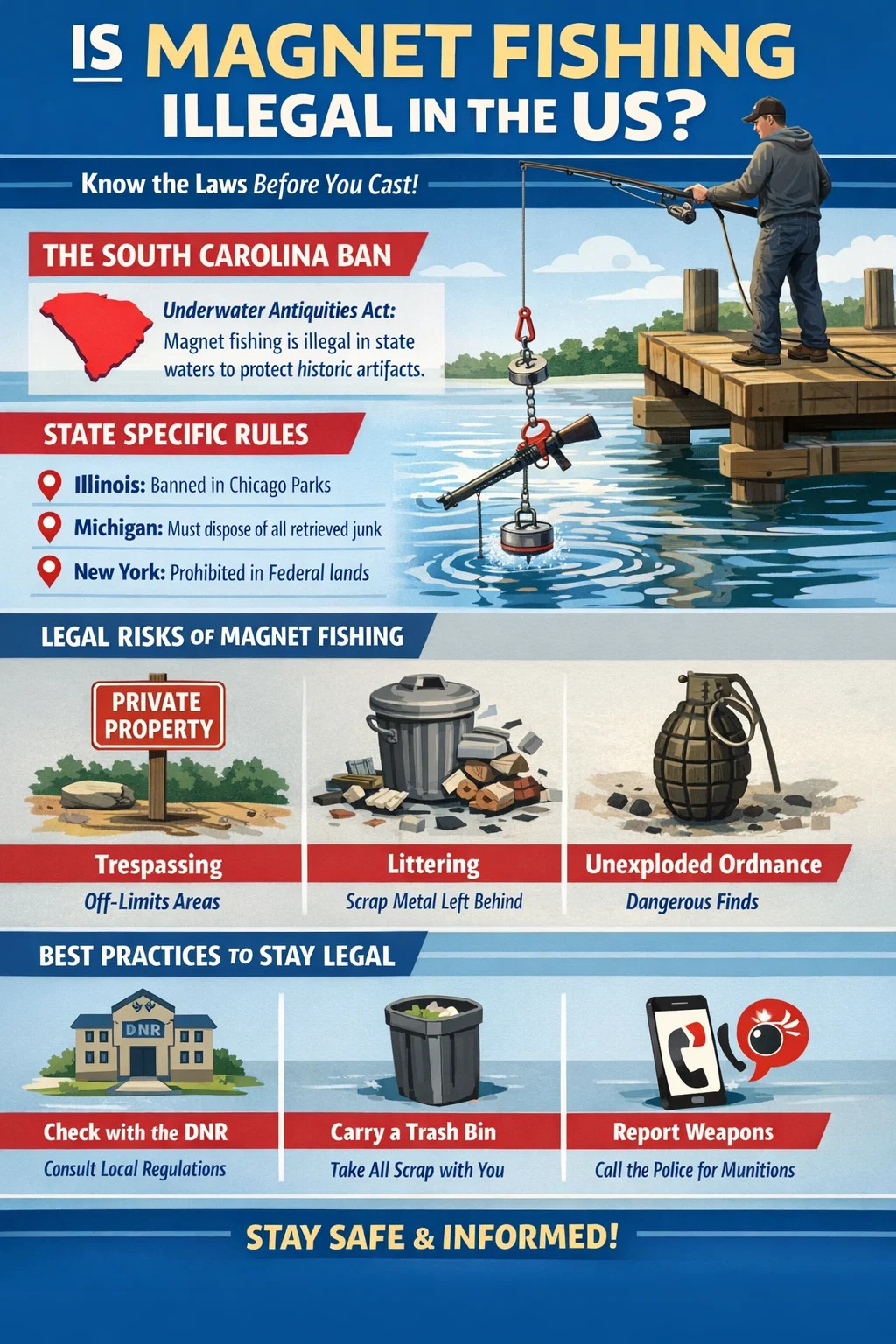 Magneetvissen wel niet illegaal op federaal niveau in de Verenigde Staten, maar het is strikt gereguleerd of ronduit verboden in specifieke staten, steden en rechtsgebieden. Het meest opvallende verbod is binnen Zuid-Carolina , waar de Wet op de onderwateroudheden het gebruik verbiedt van a vismagneet om artefacten uit staatswateren te verzamelen. In andere staten hangt de legaliteit af van lokale wetten op overtredingen, milieubescherming en mandaten van het Department of Natural Resources (DNR).